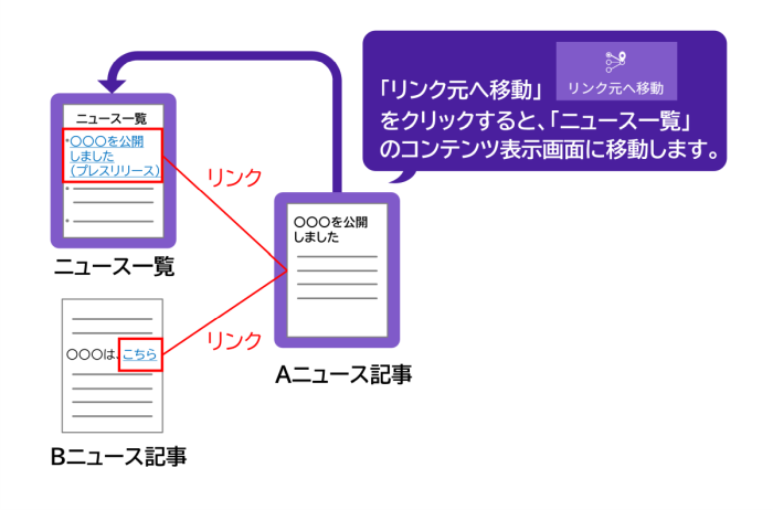「リンク元へ移動」をクリックすると、現在表示しているコンテンツがリンクされているコンテンツの表示画面に移動します。